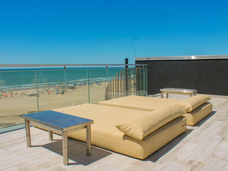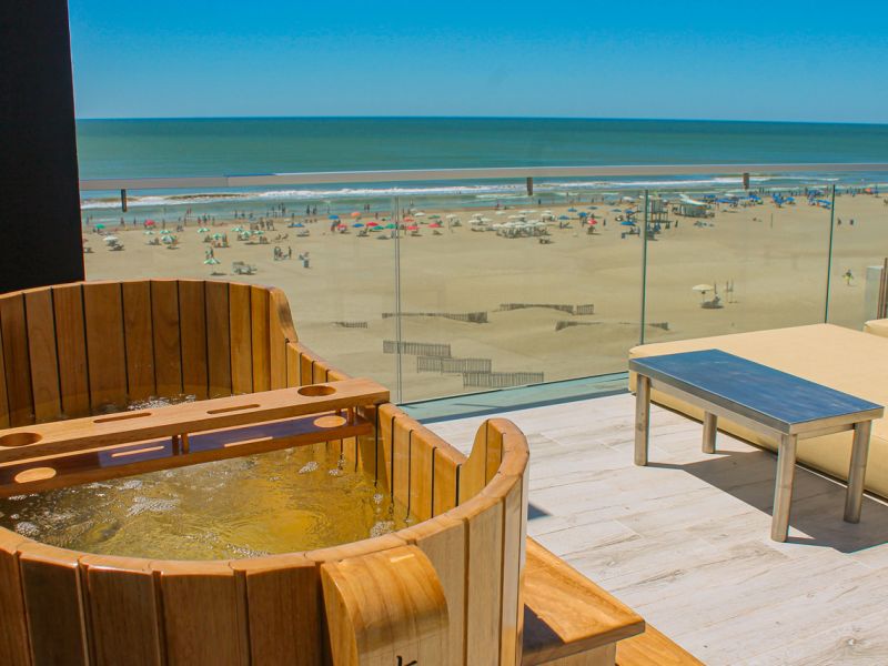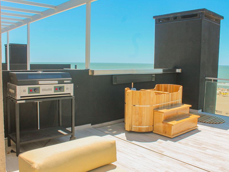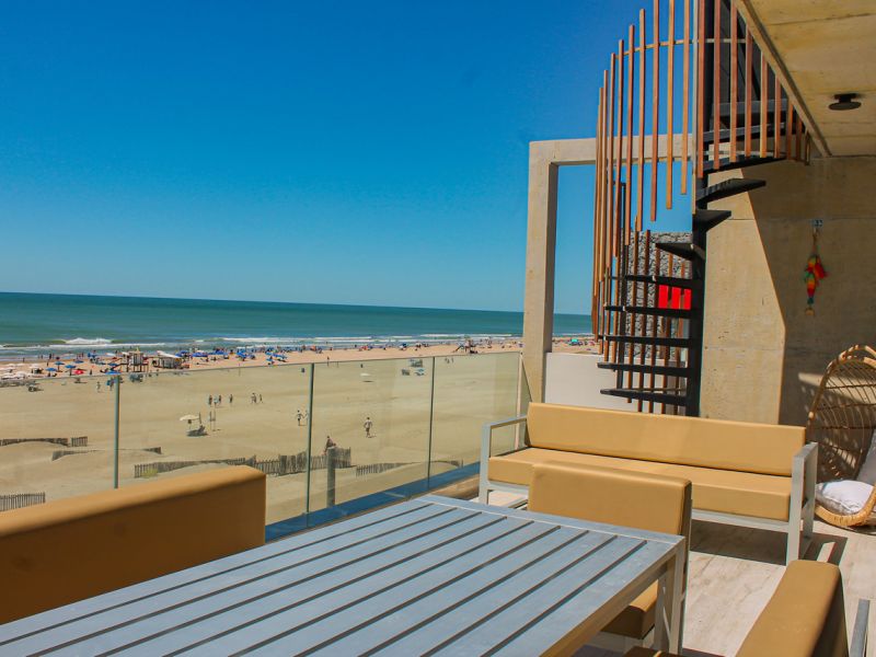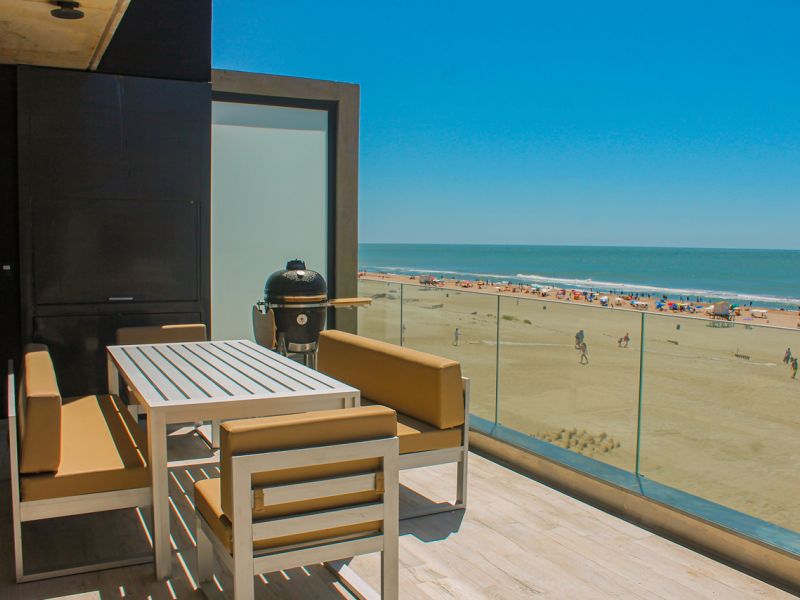 Balcón con vista plena a la playa, parrilla propia, ahumador Kamado y mobiliario de diseño.