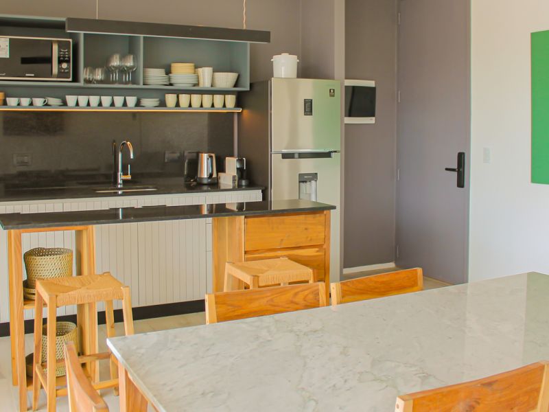 Cocina equipada con electrodomésticos y vajilla de calidad